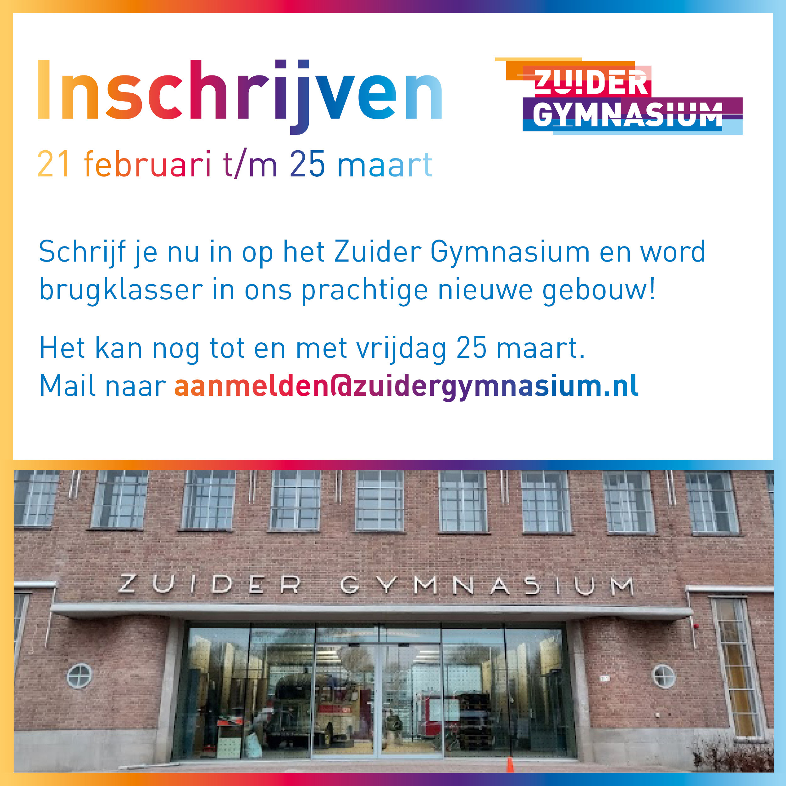 Vanaf maandag 21 februari t/m vrijdag 25 maart 2022 kunnen nieuwe leerlingen zich digitaal inschrijven op onze school. Kijk hier voor meer informatie.