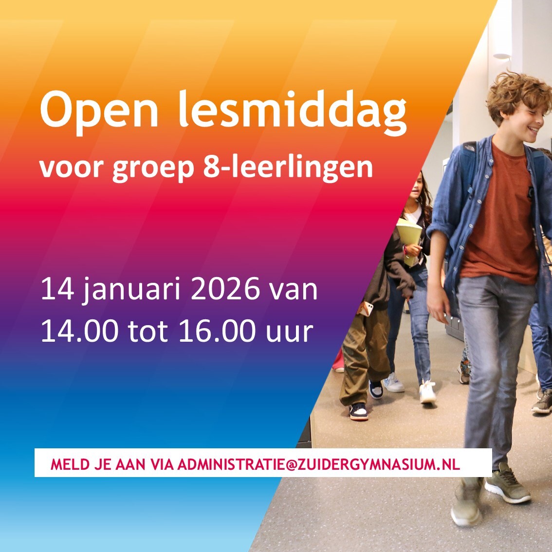 De open lesmiddag begint om 14.00 uur. Opgeven kan bij onze administratief medewerksters via administratie@zuidergymnasium.nl.
