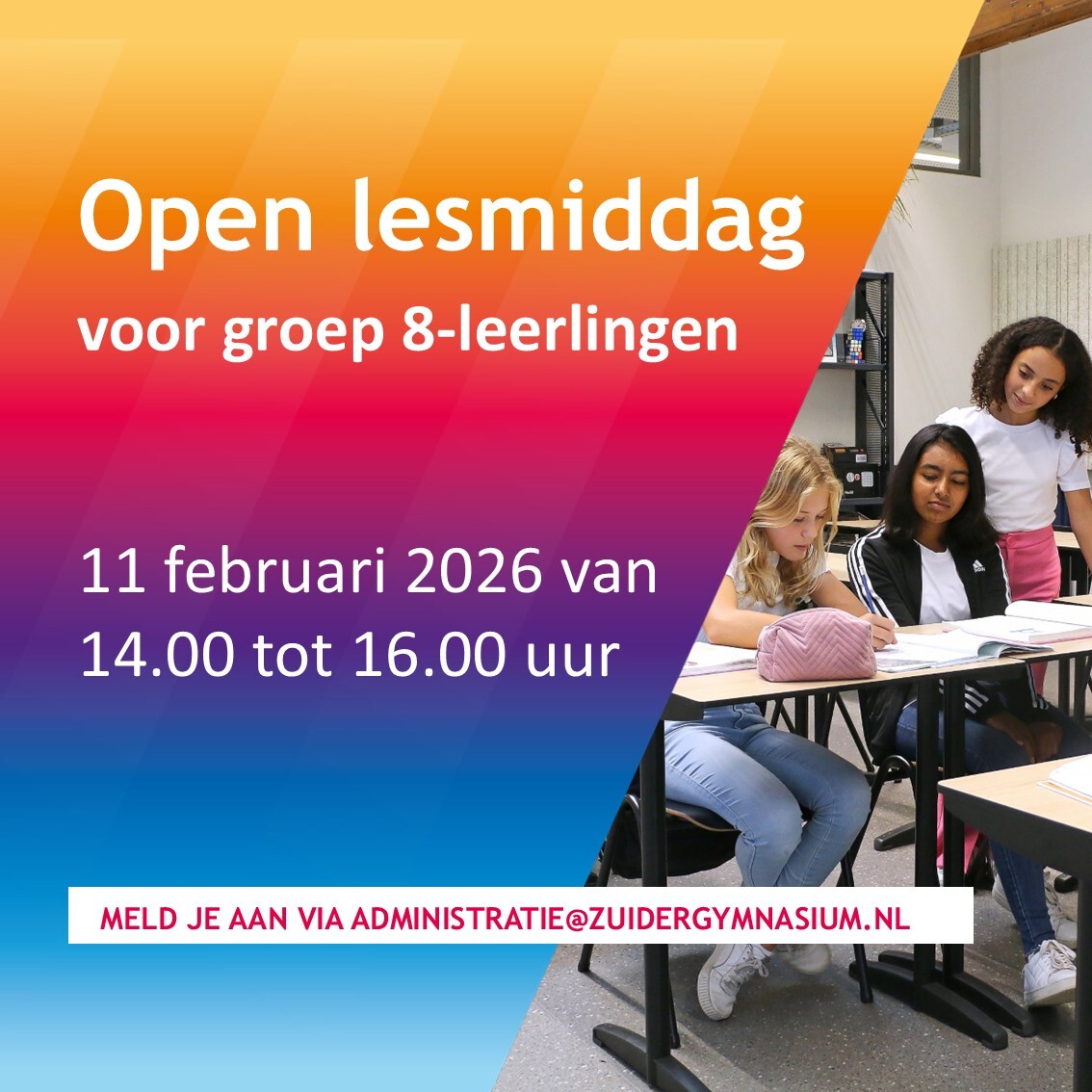 De open lesmiddag begint om 14.00 uur. Opgeven kan bij onze administratief medewerksters via administratie@zuidergymnasium.nl. Kijk hier voor meer informatie over onze open dag en open lesmomenten.