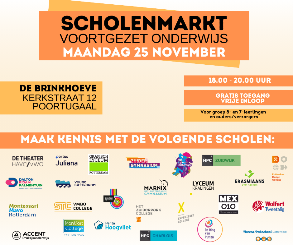 Leerlingen uit groep 7 en 8 zijn samen met hun ouders van harte welkom in De Brinkhoeve in Poortugaal om kennis te maken met meer dan twintig middelbare scholen uit Rotterdam. Tussen 18.00 en 20.00 uur staan docenten en leerlingen van deze scholen klaar om een indruk te geven van het veelzijdige onderwijsaanbod in de stad. Vooraf aanmelden is niet nodig en de toegang tot de markt is gratis.