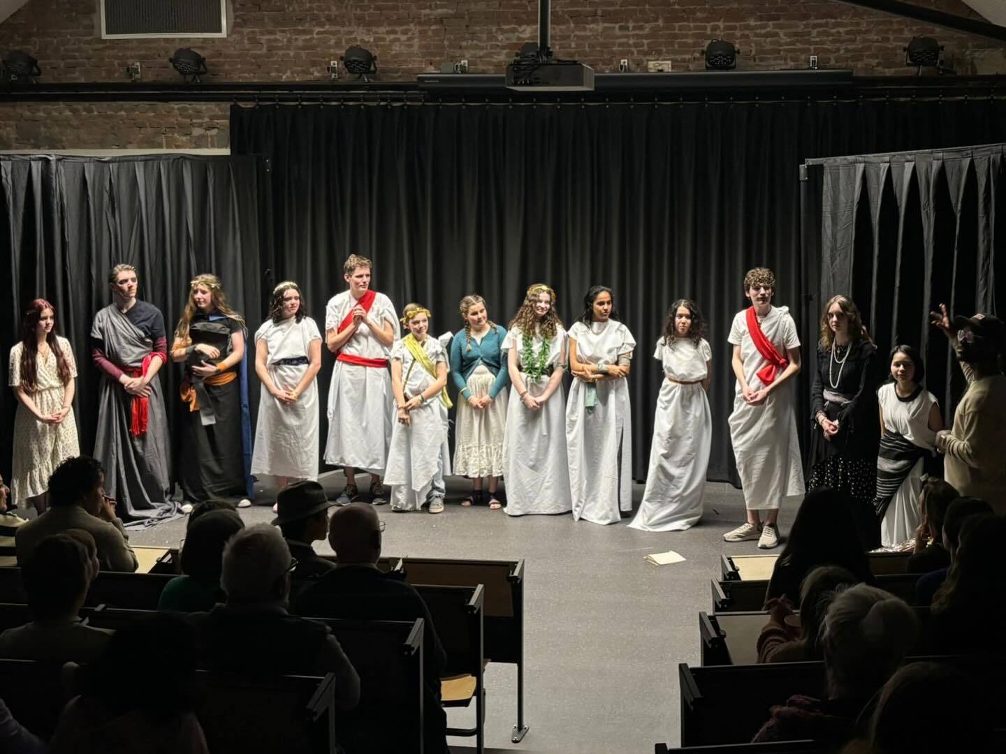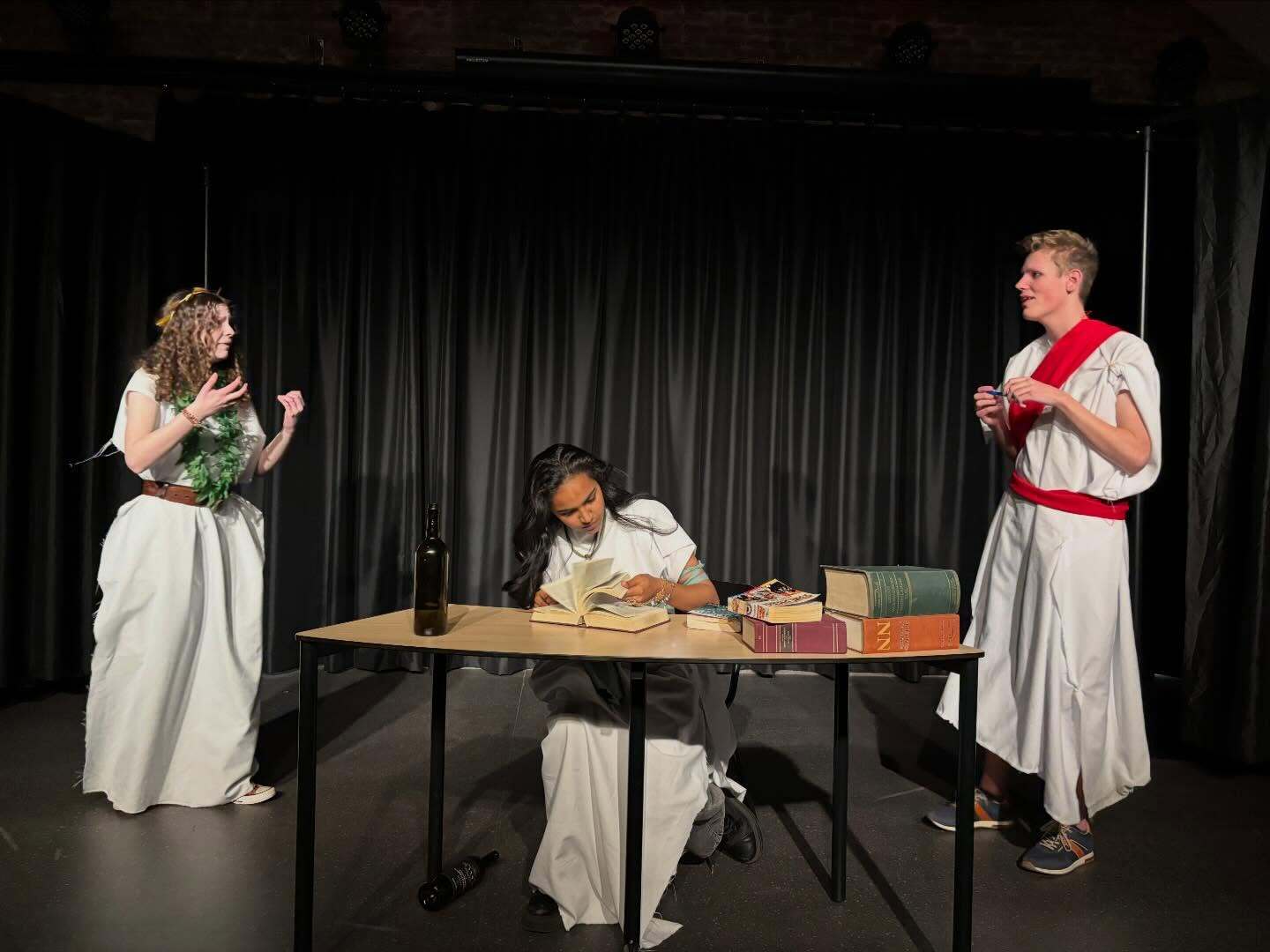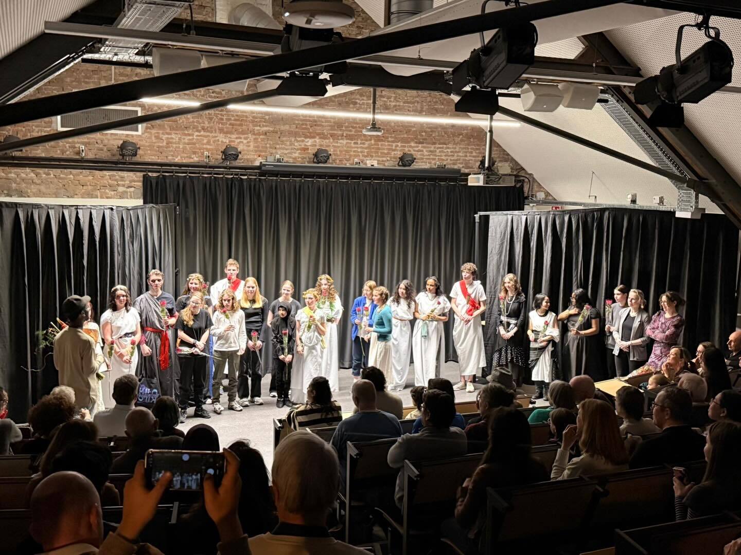 Na deze grondige voorbereiding was het vrijdag eindelijk zover: in een vol auditorium voerden de leerlingen de twee stukken, genaamd 187 en Vergilius, op voor hun familieleden en vrienden. Na afloop van elk stuk klonk – terecht – een daverend applaus uit het publiek. Als afsluiting kregen alle leerlingen een roos voor hun prestatie. Ook waren er een fraaie bos bloemen, een cadeau namens de leerlingen en een hartelijk dankwoord voor Nana Gibson, de theaterdocent die onze leerlingen de afgelopen maanden intensief heeft gecoacht richting deze mooie avond.