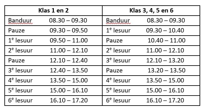 Een les duurt bij ons zeventig minuten en daarnaast begint elke schooldag met een banduur. Binnen de banduren en de lessen wordt flexibel onderwijs op maat verzorgd, waarbij ruimte is voor zowel remediëring als verdieping en verbreding.